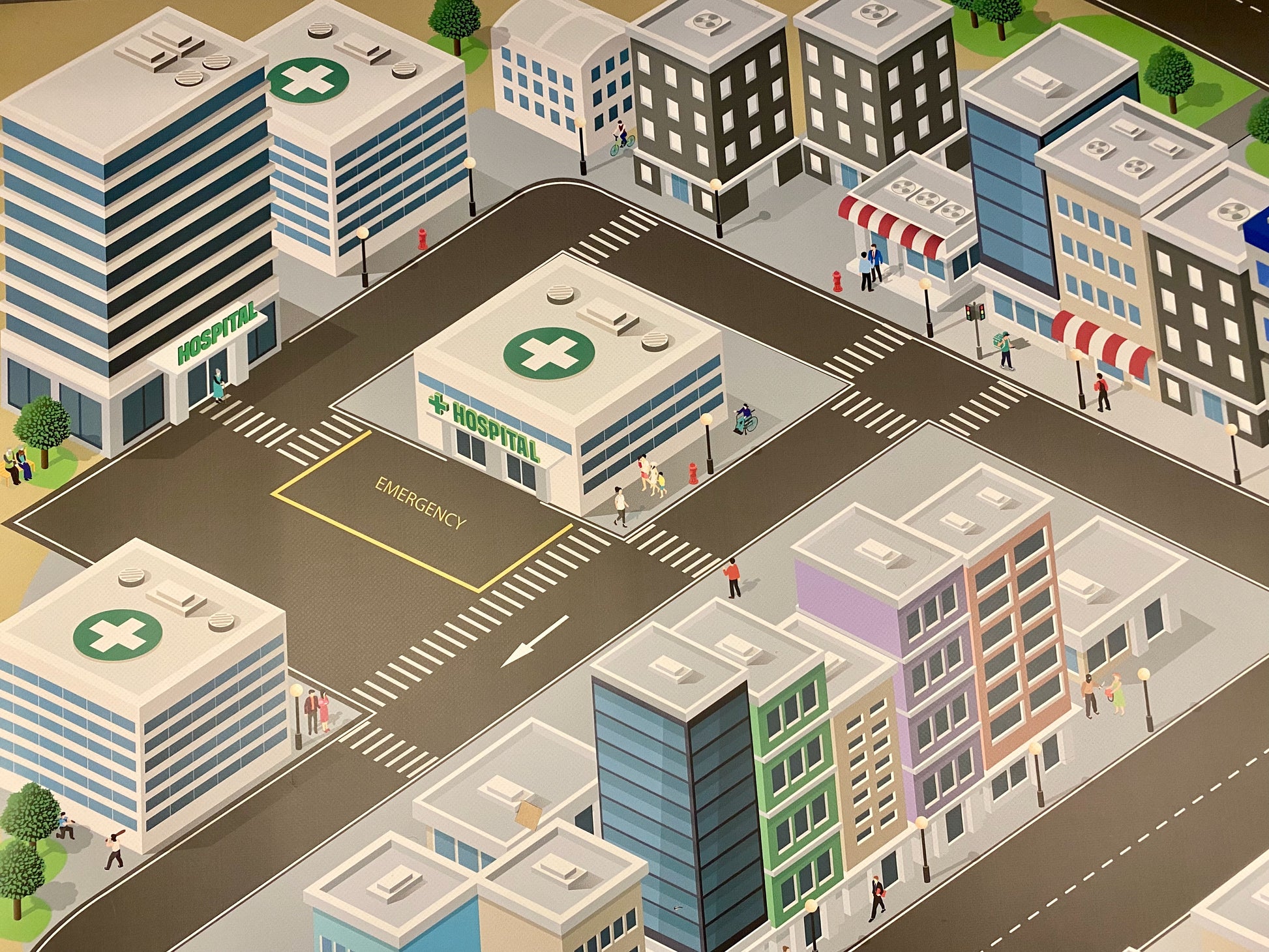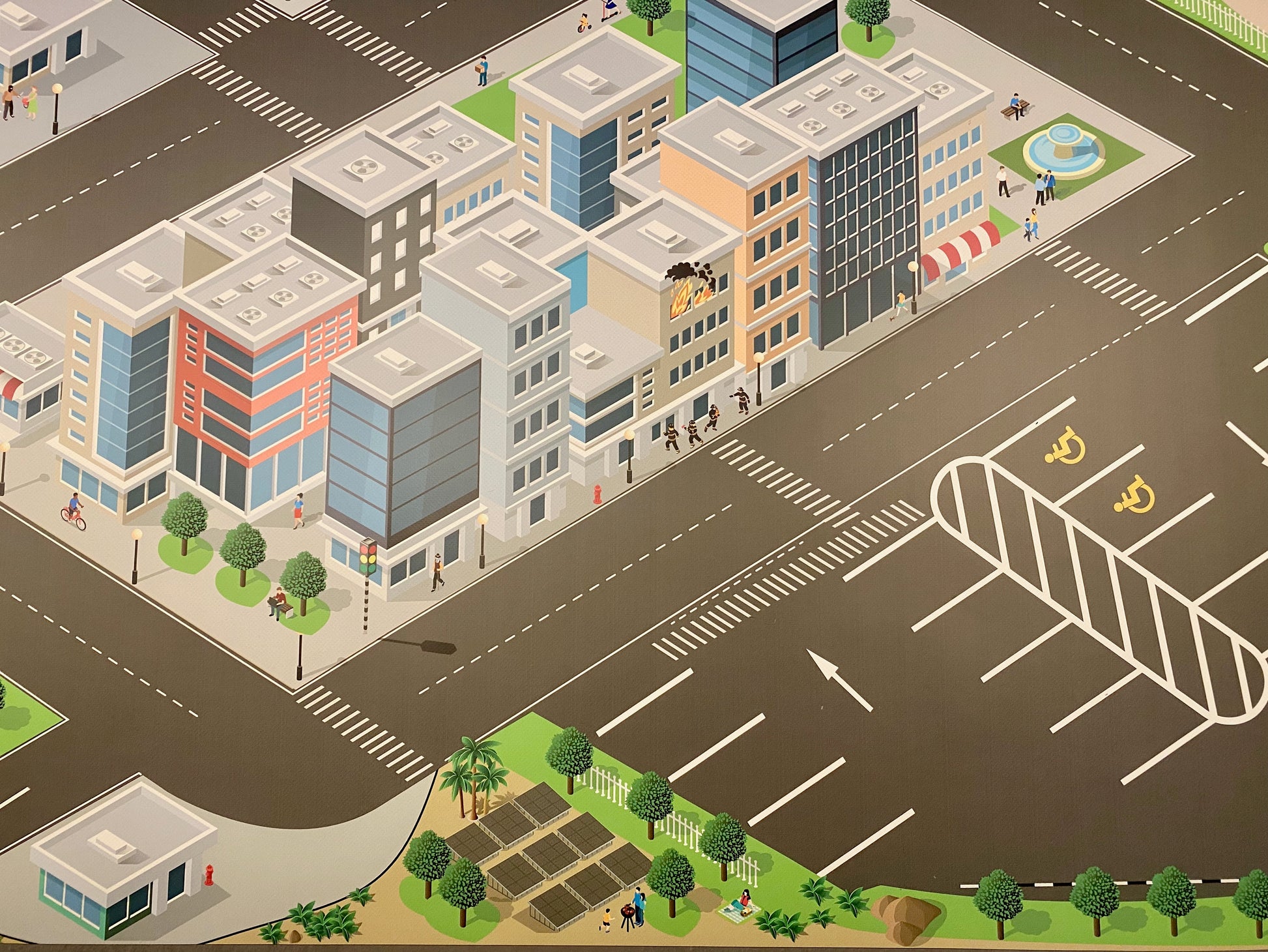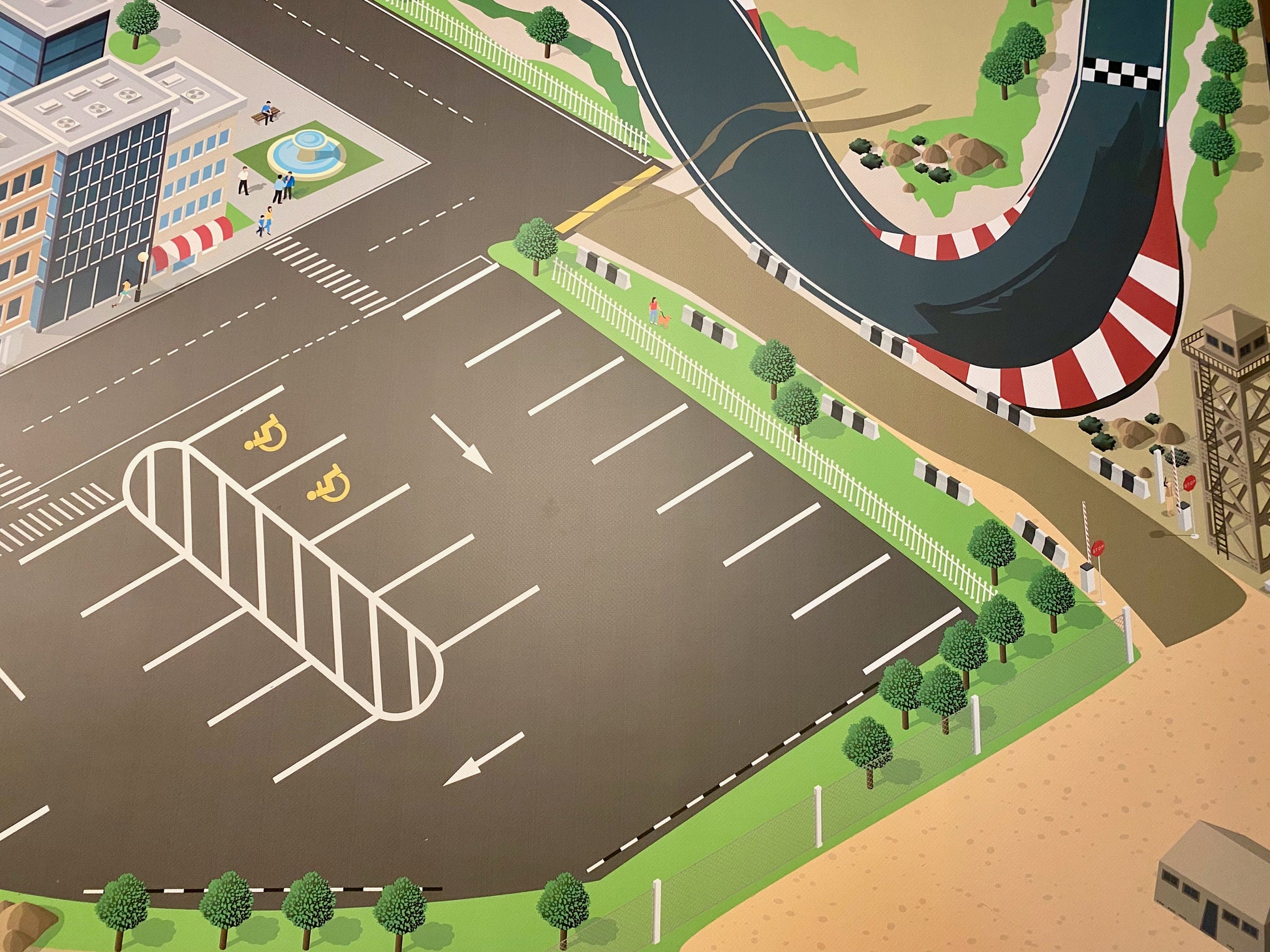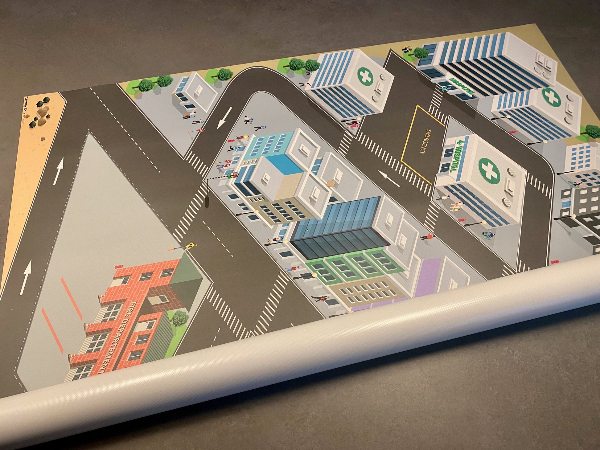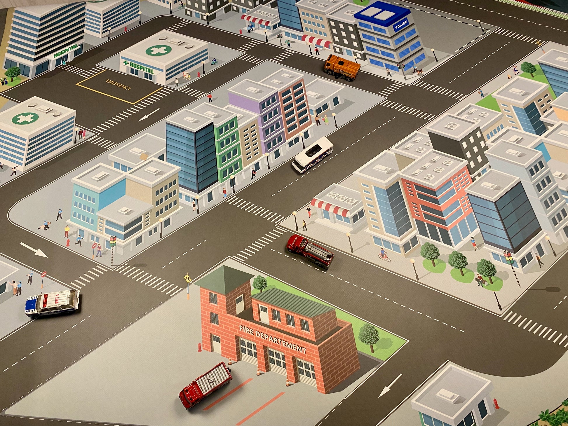 Diese Spielstadt für Spielzeugautos hebt sich deutlich ab von den üblichen Designs. Hier kann man seine Fahrzeuge in realistischem Maßstab bewegen. Die Größenverhältnisse der Gebäude und abgebildeten Personen passen perfekt zu den Modellen!